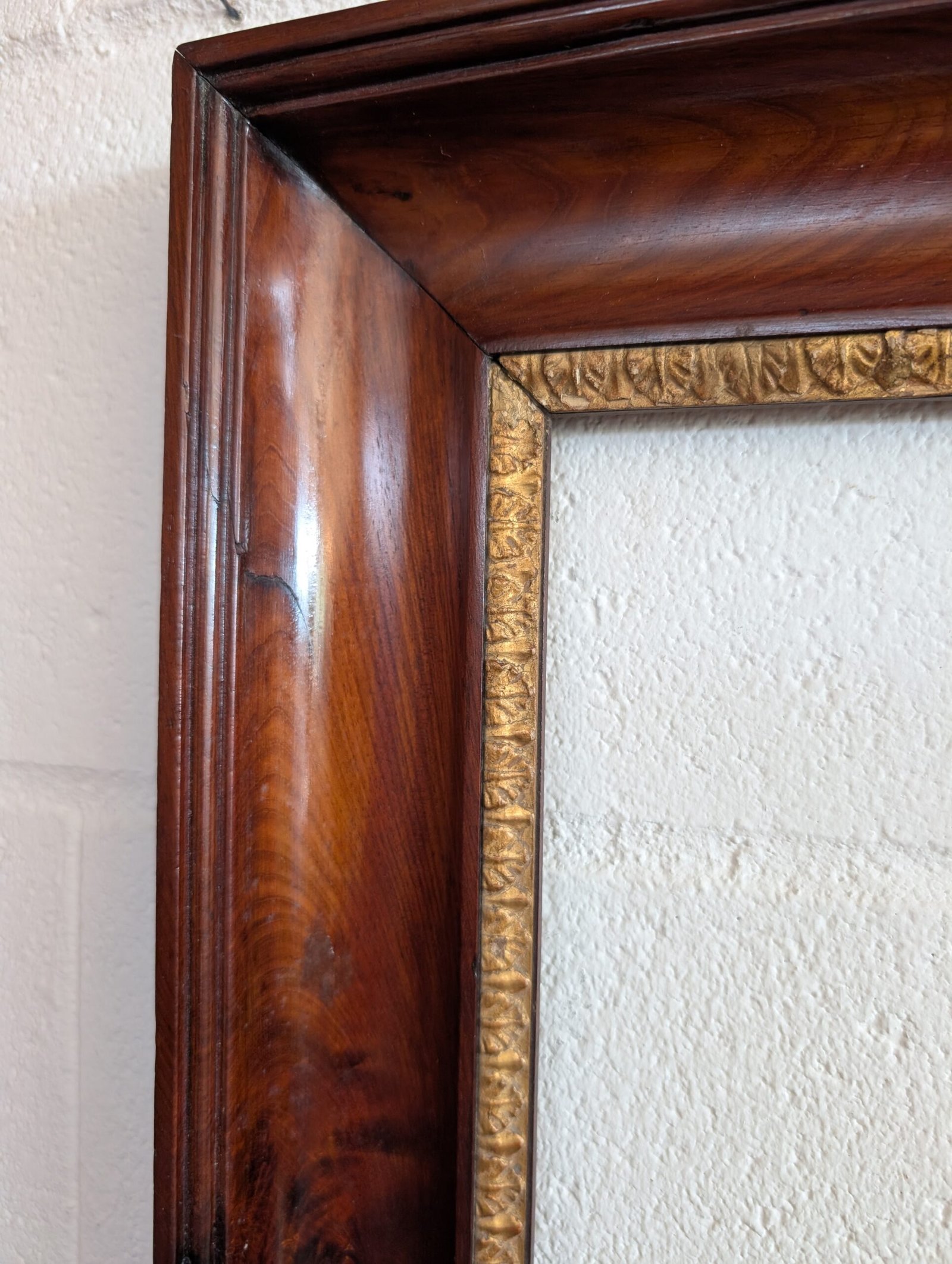 Cornice antica di pregio, realizzata in legno di mogano massello con elegante bordo interno dorato e decorato a palmette, databile alla prima metà dell’Ottocento.