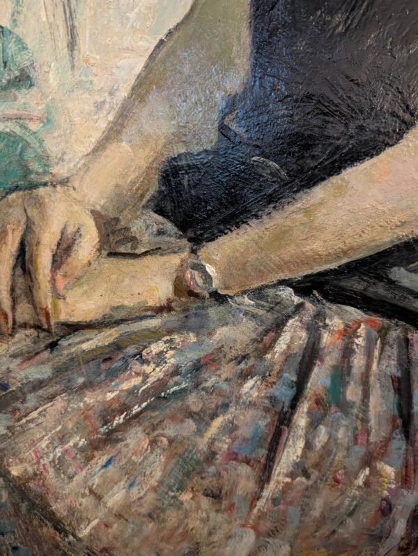 L’opera raffigura una giovane donna seduta su una sedia, con indosso una blusa nera impreziosita da un filo di perle verdi e una gonna dai toni delicati e vibranti. L’artista impiega una pennellata corposa e materica, caratteristica della sua produzione, che conferisce alla figura un’intensa presenza e profondità psicologica.