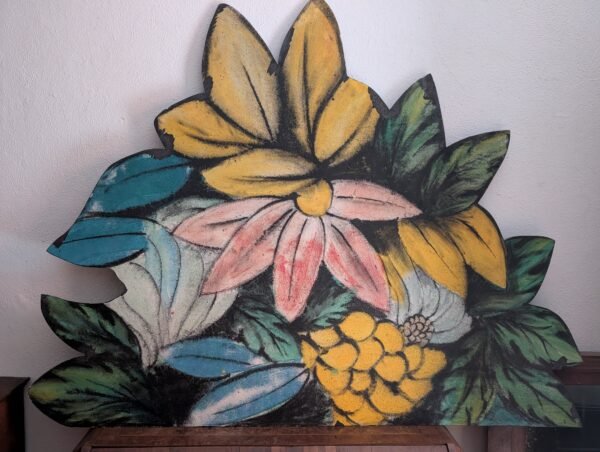 Affascinante pannello sagomato in legno dipinto, raffigurante un ricco bouquet di fiori e foglie dai colori vivaci. L’opera si distingue per l’impatto scenografico, il segno deciso e la brillantezza cromatica che ne fanno un pezzo di grande forza decorativa.