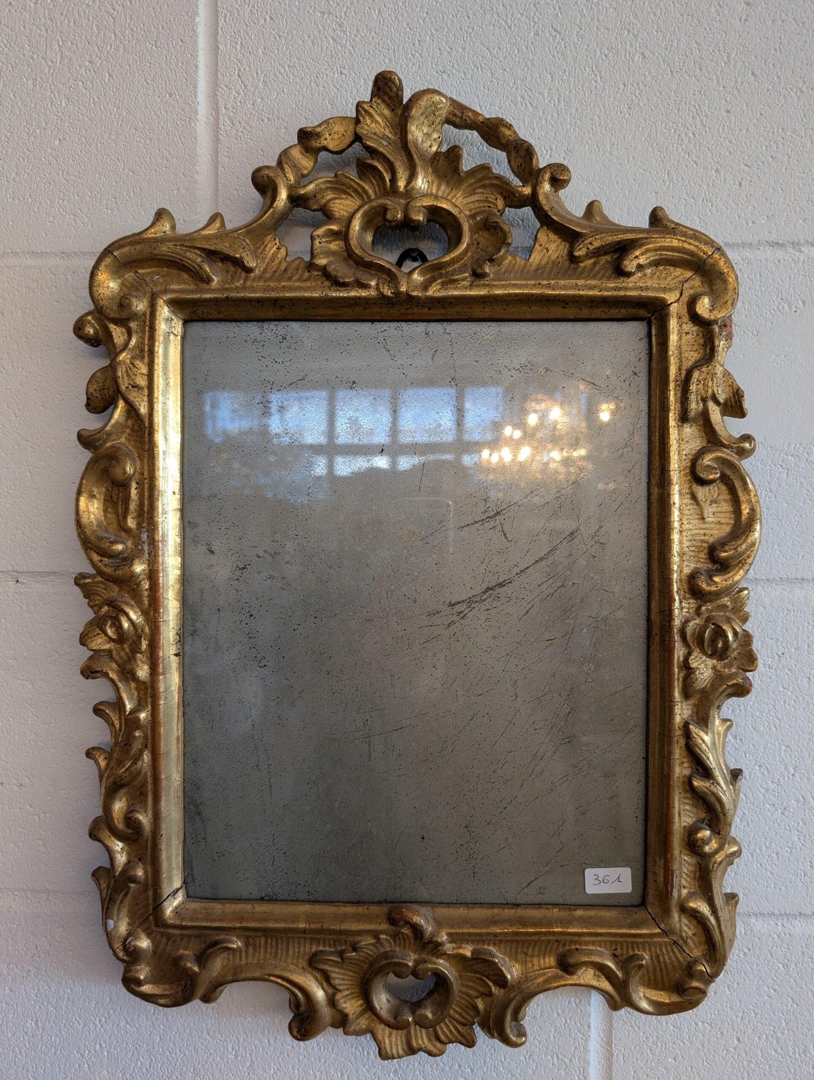 La doratura conserva la patina originale, che testimonia l’autenticità e il fascino del tempo. Lo specchio al mercurio è coevo e presenta la naturale ossidazione che arricchisce l’insieme di un carattere unico e di grande suggestione.