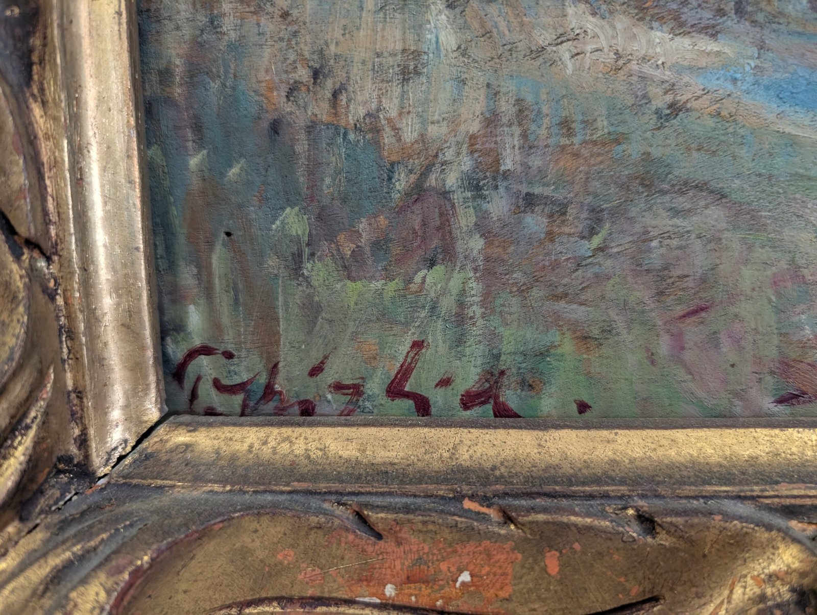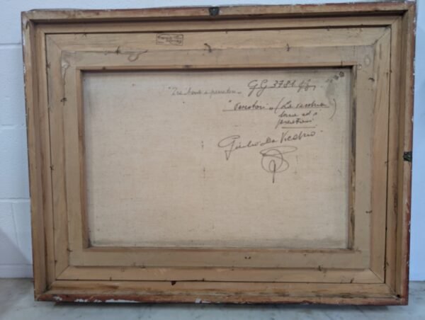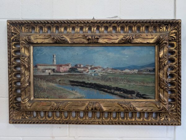 L’opera presenta una stesura pittorica materica e stratificata, con un tratto deciso e privo di eccessi descrittivi, tipico della pittura toscana del Novecento. La prospettiva è costruita attraverso la sovrapposizione di piani cromatici, mentre l’atmosfera complessiva restituisce una scena di quiete urbana immersa in un contesto rurale. La cornice lignea dorata, di gusto intagliato, è coeva o prossima all’epoca di esecuzione.