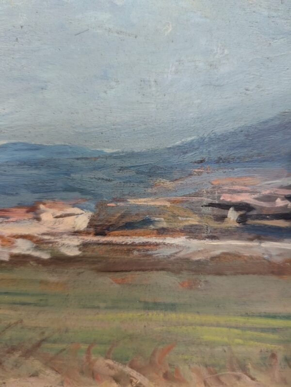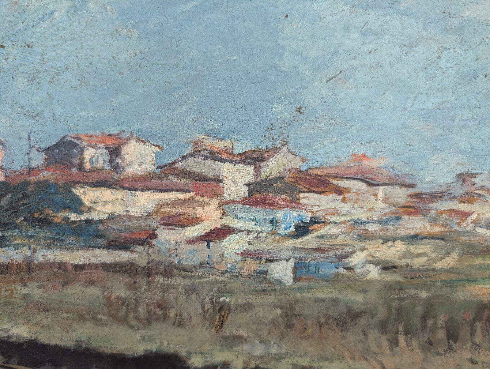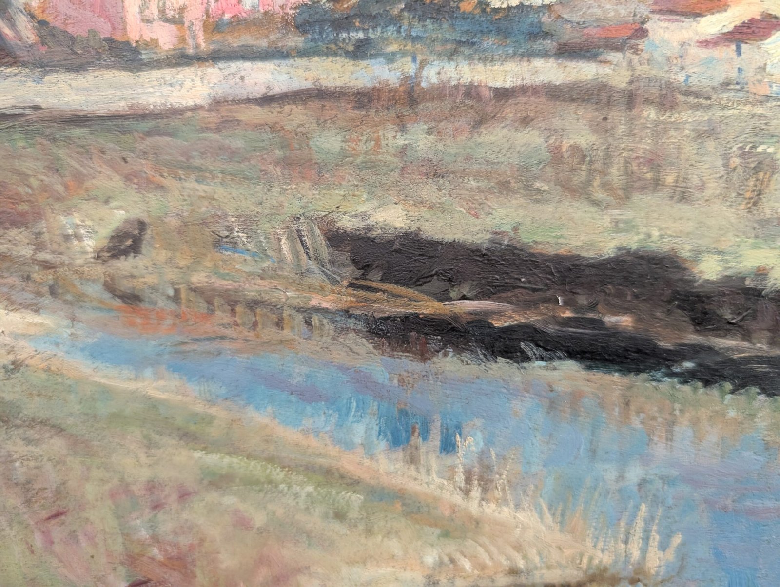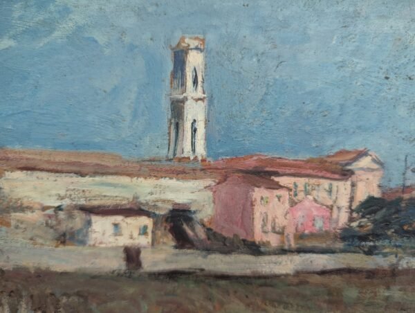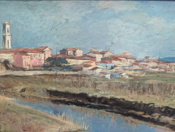 Veduta paesaggistica raffigurante il quartiere dell’Ardenza a Livorno, caratterizzata da un’impostazione orizzontale che valorizza la profondità prospettica. In primo piano si sviluppa un corso d’acqua incorniciato da argini erbosi, che conduce lo sguardo verso il nucleo abitato al centro della composizione. Le costruzioni, rese con pennellate compatte e cromie calibrate tra ocra, rosso e rosa, si stagliano su un cielo terso dalle tonalità azzurre, con sullo sfondo un campanile isolato che funge da elemento verticale dominante.